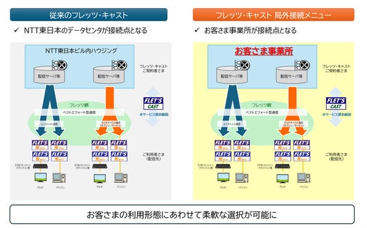 現在提供中の「フレッツ・キャスト」は当社指定のデータセンターのご契約を必須としてサービスを提供しておりましたが、近年、多様な接続形態を要望するニーズが増えていることを踏まえ、当社指定のデータセンターのご契約がなくても「フレッツ・キャスト」をご利用可能な本メニューの提供を開始いたします。