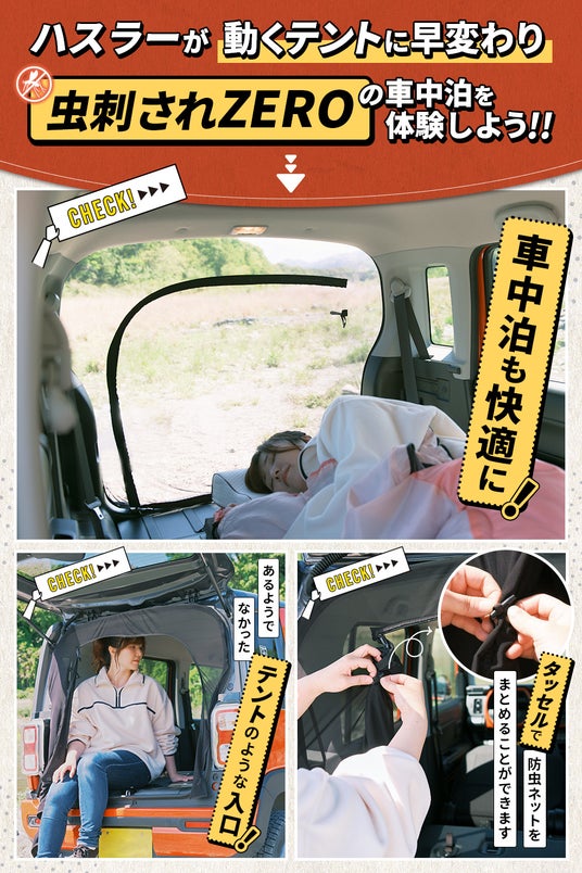 ありそうでなかったテント型のバックドア防虫ネット。ハスラーのバックドアの形にフィットした専用設計することで虫が入る隙間をカット。ハスラーの可愛さをそのまま生かせる防虫ネットに仕上げました。ハスラー独特のリアの形状に合わせて作りましたので、隙間がなく車中泊の天敵を完全ガードしてくれます。