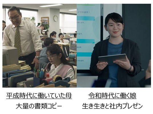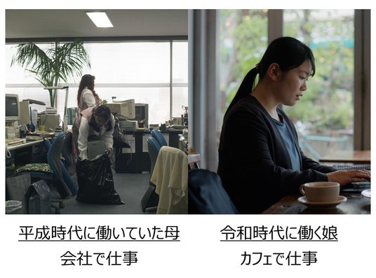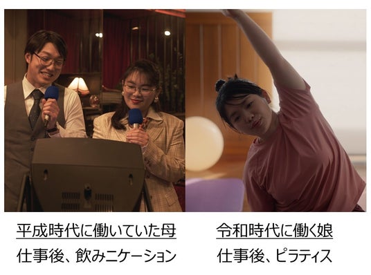 2008年より放映している企業CM『家族の絆』シリーズの新作として、「ふたつの人生」篇を3月26日(水)より公開します。本CMでは、令和の時代に働く娘と、平成の時代に働いていた母親の姿を通して、今と昔の価値観の違いを描いています。夕方早々に会社を出てピラティスに行く娘に対し、仕事終わりに社員みんなで“飲みニケーション”に行く母親など、それぞれの時代の“当たり前”の違いが映されます。