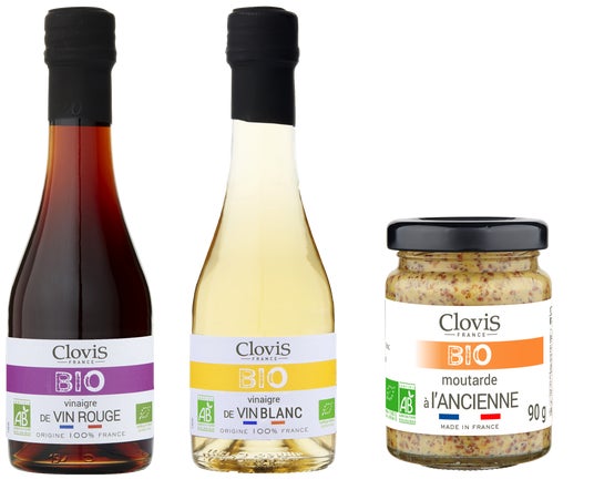 フランスのブランドClovisよりBIOの調味料として、プチッとした 食感にピリッとした辛味の粒マスタード、香り高い品種のぶどうを搾汁・醸造した白ワインをベースにしたフルーティーな香りが特長の白ワインビネガー、厳選された上質の赤ワインで作ったコクと深みのある伝統的な味わいの赤ワインビネガーを販売します。