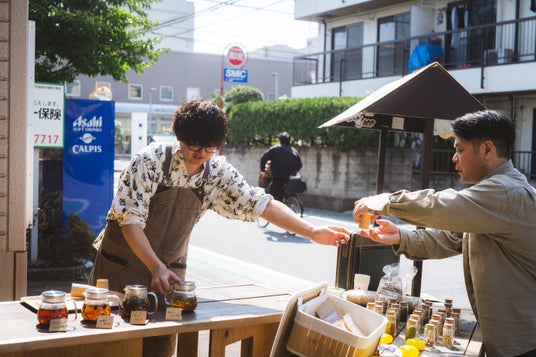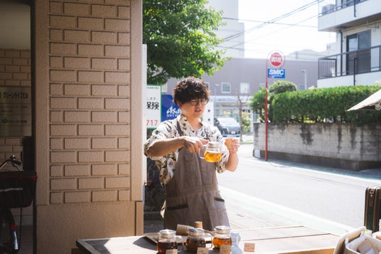 薬剤師のかたわら、休日には屋台を引いて薬膳茶を無料で提供し、他愛無い会話から悩みごとや困りごとをこぼしてもらう活動をしている石丸勝之さん。自身で調合する薬膳茶を、来訪した人に「処方」します。