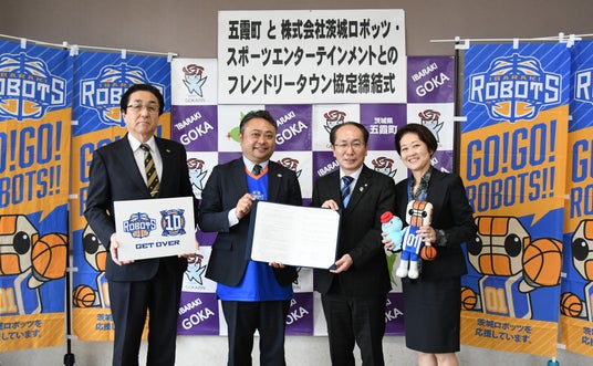 五霞町「ごかまち」(町長:知久 清志)は、Bリーグプロバスケットボールチーム「茨城ロボッツ」の運営法人である、株式会社茨城ロボッツ・スポーツエンターテインメント(代表取締役社長:川崎 篤之氏)と、3月28日、フレンドリータウン協定を締結しました。