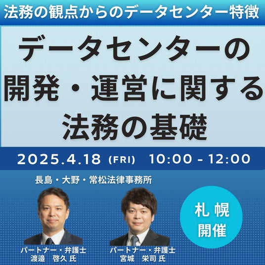 JPI(日本計画研究所)は、長島・大野・常松法律事務所 パートナー・弁護士 渡邉 啓久 氏、パートナー・弁護士 宮城 栄司 氏を招聘し、データセンターの開発・運営に関する法務の基礎と最新の論点について詳説いただくセミナーを開催します。