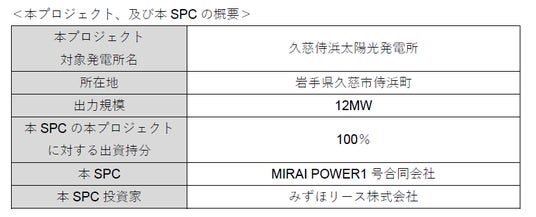 当社は、国内1か所の特別高圧太陽光発電所プロジェクト(以下「本プロジェクト」)へMIRAI POWER1号合同会社(資金調達を行う特別目的会社、以下「本SPC」)を通じて出資参画をしましたので、お知らせいたします。