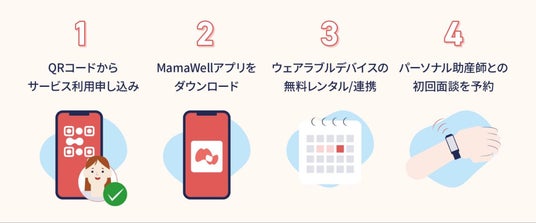 ウェアラブルデバイスを装着し、妊婦のヘルスデータを記録・モニタリング。身体活動や心拍の乱れをパーソナル助産師がチェックして、妊娠合併症のリスク低減を目指します。