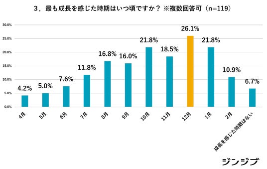 冬(10~12月):12月(26.1%)に成長実感が最も高くなりました。9月までに身に着けた業務のアウトプットで徐々に成果が見え、成長を実感する機会が増えます。さらに会社によっては年末年始の忙しさを乗り越えることで責任感が増し、より成長角度の高さを感じやすくなったのではと推察できます。また、1年を振り返る機会があることが自身の成長を感じるきっかけにもなったのではないでしょうか。