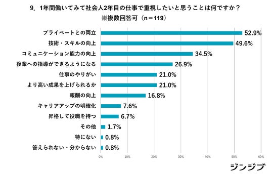 ● 社会人2年目の優先事項は「プライベートの両立」(52.9%)と「スキル向上」(49.6%)。