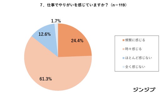 仕事のやりがいを感じるかという質問では、「時々感じる」(61.3%)が最多でした。「頻繁に感じる」(24.4%)を合わせて、85.7%の方が仕事にやりがいを感じる機会がありました。成長の過程にある高卒の新社会人はやりがいに波があると考えられます。