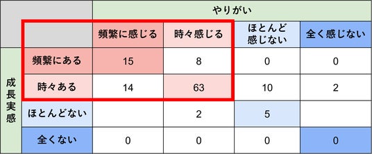 一方で、14.3%の人は仕事にやりがいを見いだせていません。成長実感が頻繁にある人はやりがいを感じています。なぜやりがいが生まれていないのか、成長実感にも目を向けて改善策を考えることが重要です。