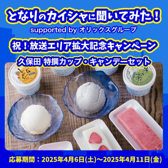 放送エリア拡大を記念して4月5日(土)から4月11日(金)まで、番組公式X(旧Twitter)でフォロー&リポスト(旧リツイート)キャンペーンを開催予定です。過去番組ゲストにも登場した高知のカイシャ、久保田食品株式会社の「久保田 特撰カップ・キャンデーセット」を抽選で10名さまにプレゼントいたします。詳しくは4月5日、公式X(https://twitter.com/tonarinokaisha)をチェック。是非、お楽しみに。