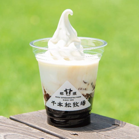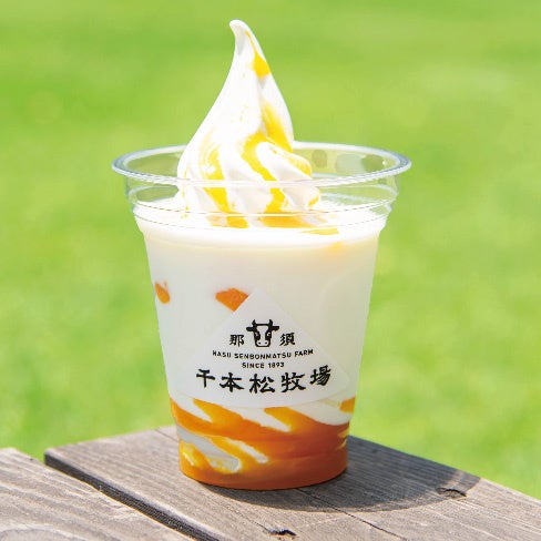 千本松ミルクソフトと牛乳にマンゴーソースをたっぷりかけた、フルーティーななスイーツ。