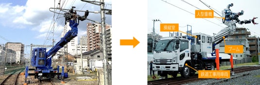 多機能鉄道重機は、人機一体、JR 西日本、日本信号により共同研究開発された、社会実装コンセプトとしての PoC 試作機『零式人機 ver.2.0』をベースとして開発・製造されており、「力制御・トルク制御技術」「パワー増幅バイラテラル制御技術」などの人機一体独自の先端ロボット工学技術が搭載されています。零式人機 ver.2.0 同様に、ブーム先端に人型重機が搭載されており、人は安全な場所に設置された操縦席から人型重機を遠隔操作することで、人が危険な高所に登ることなく高所重作業を行なうことが可能となります。
