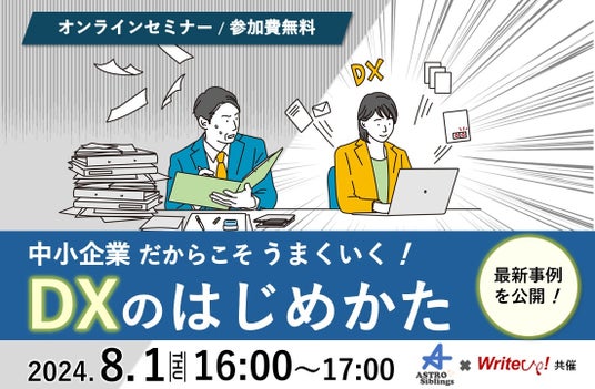 企業のデジタルトランスフォーメーション(DX)支援を手掛けるASTRO Siblings株式会社(以下「ASTRO Siblings」)と株式会社ライトアップ(証券コード6580)は、DXに取り組みたい中小企業・小規模事業を対象にした無料オンラインセミナーを8月1日(木)に開催いたします。