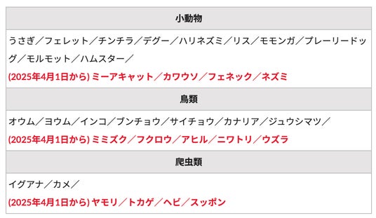 このたび、当社ビジョンに基づいた取り組みの一環として、小動物・鳥類・爬虫類区分における加入可能品種を以下のとおり拡大し、同区分における加入可能年齢の制限を廃止いたします。