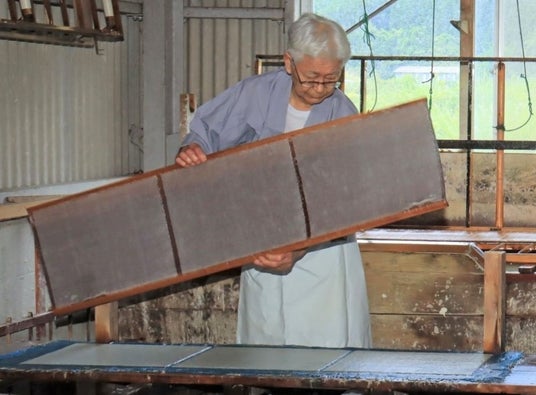 菊地孝氏は代々この紙の手漉きを生業とする菊地家の7代目です。2枚の紙を合わせることで強度を持たせる泉貨紙ですが、氏の製法では桁(けた)の上に目の粗さが違う2枚の簀を上下に並べて置き、同時に漉いてから合わせることで、より強度の高い作品を生み出しています。また、その強靭さから、東大寺二月堂・お水取りの練行衆着用の「紙衣」(かみこ)にも使用されています。現在、代々泉貨紙を製造しているのは、全国で菊地家のみとなり、その技術の保存伝承への尽力が評価され、今回の受賞となりました。