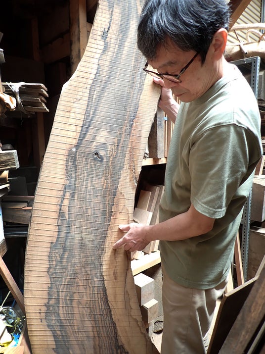 令和6年 工房で黒柿の材料を観る(撮影:川崎 了)