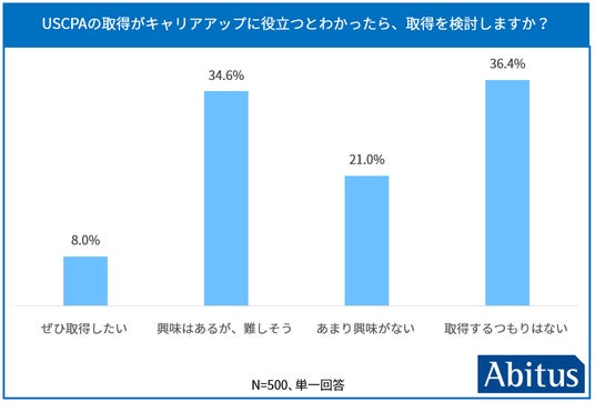 認知度が低い背景には、「難しそう」「自分には無理かも」というイメージも影響しているようです。仮に「USCPAの取得が就職やキャリアアップに役立つと分かったら取得を検討するか」を質問したところ、「ぜひ取得したい」と前向きな回答は8%にとどまりました。