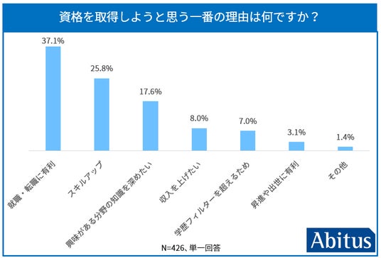 - 資格取得の目的:資格を目指す理由として最も多かったのは「就職・転職に有利になるから」(37.1%)で、次いで「スキルアップのため」(25.8%)が挙がりました