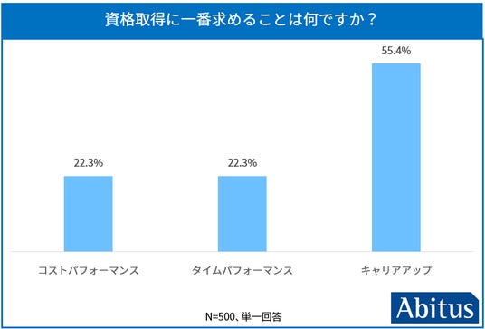 また、資格取得にあたり重視する点としても、「就職・転職・昇進に有利な資格が欲しい」(キャリアアップ)を挙げる学生が55.4%と過半数を占め、コストの低さ(22.3%)や短期間で取得できること(22.3%)よりも優先されました。