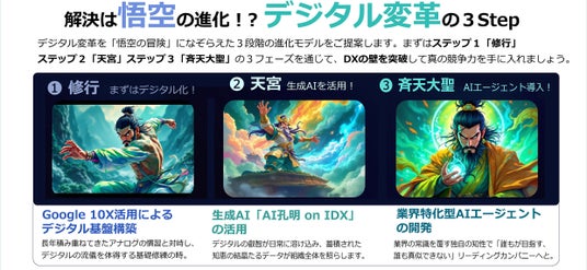 本プログラムは、AI孔明 on IDXとGoogle Workspaceを活用し、製造現場におけるAIエージェント導入を段階的に支援する教育・導入支援プログラムです。構成は、まるで孫悟空が「斉天大聖」へと進化する過程のように、三つの難関を乗り越えるストーリー設計となっています。