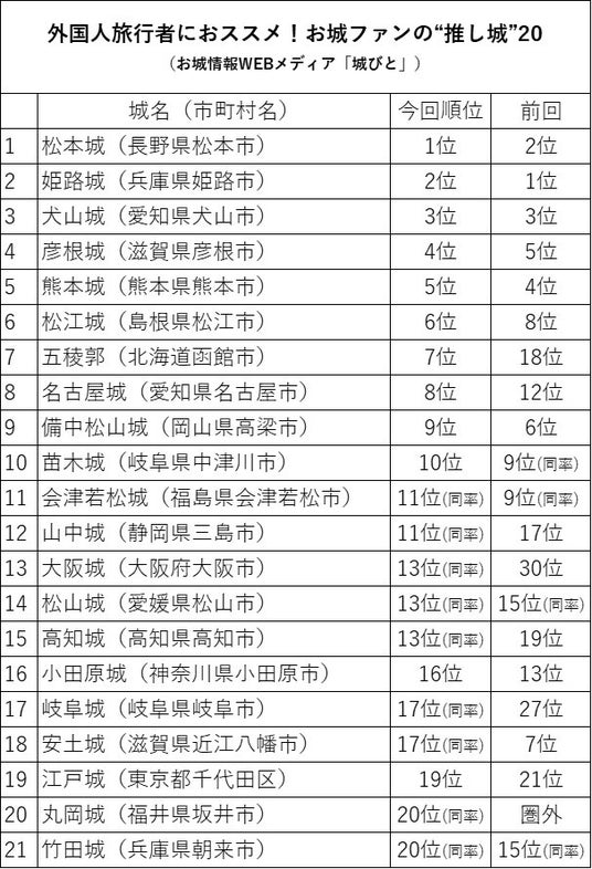 【訪日外国人旅行者におススメしたい!お城ファンの“推し城”TOP20】
