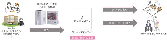 「ジェームズマーティン フレッシュサニタイザー 詰め替え用4.8L バッグインボックス」の容器外箱に障がい者アートを印刷し、売り上げの一部をアートをご提供いただくアーティストおよび所属団体に寄付することにより、障がいがある方々の活動を応援しています。