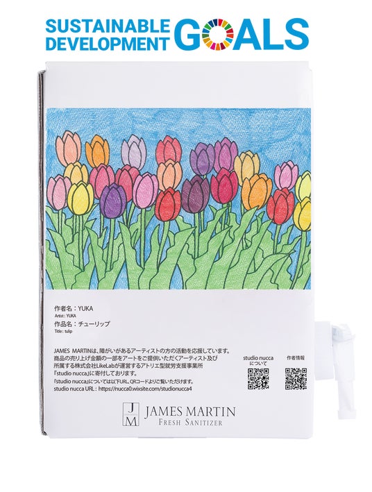 明るい色彩で描かれた華やかで愛らしいデザインは、キッチンやパントリー等に見せ置きするのもおすすめです。ジェームズマーティンでは、今後も定期的にデザインの変更を行い、より多くのアーティスト、団体を応援してまいります。チューリップの花言葉である「おもいやり」を感じながら、SDGsをより身近に考えるきっかけにしてみませんか。環境への配慮と障がいがあるアーティストの応援を両立した「ジェームズマーティン フレッシュサニタイザー 詰め替え用4.8L バッグインボックス」を手に取ることで、日常にさりげなく“やさしい選択”をプラス。あなたの思いやりが、次の未来をつくる一歩になります。ぜひこの機会にお試しください。