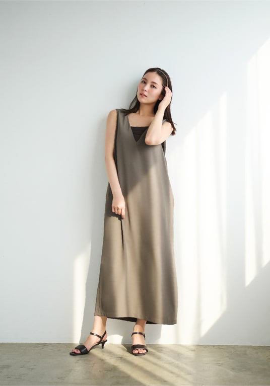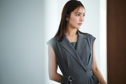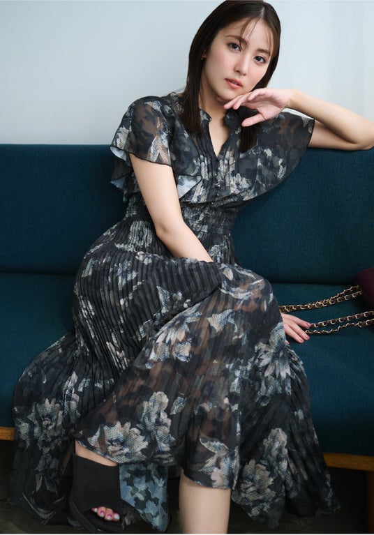 2. 前後2WAYで着られる美シルエットのドレスは都会的に着られる秋色を選択