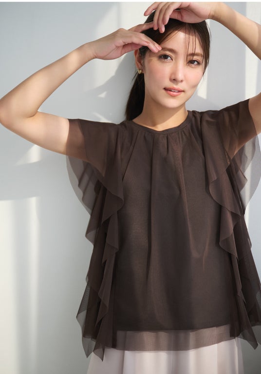 5. 繊細なチュール使いが魅力的なトップスで、ワンランク上の抜け感を