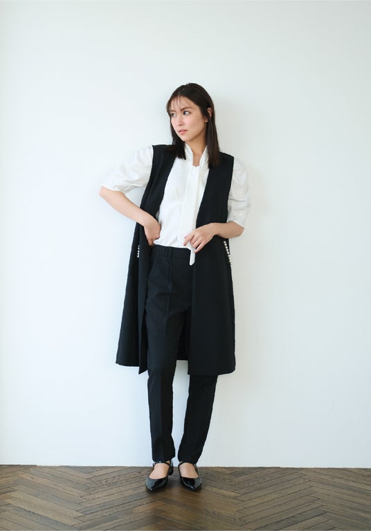GILET / ¥24,200、BLOUSE / ¥16,500、PANTS / ¥16,500、PUMPS / ¥17,600