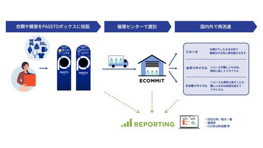 栃木・茨城県内のカンセキ6店舗に「PASSTO(パスト)」の不要品回収ボックスを設置し、不要となった衣類・雑貨・ホビー用品を回収します。回収した不要品は、ECOMMITが国内外でリユース品として再流通させるほか、リユースが難しいものはリサイクルパートナーを通じて再資源化等を行います。