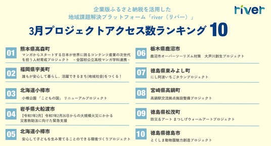 企業版ふるさと納税を活用した地域課題解決プラットフォーム「river(リバー)」を運営する株式会社カルティブ(本社:神奈川県横浜市、代表取締役:池田 清)は、企業版ふるさと納税ポータルサイト「企ふるオンライン」における2025年3月度寄附プロジェクトのアクセス数ランキングを発表します。