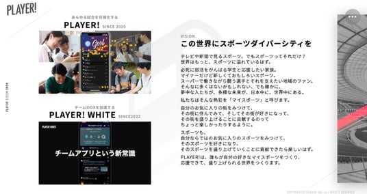 ▶︎事業内容:スポーツコミュニティアプリ「Player!」および「Player! WHITE」の開発・運営、スポーツ情報インフラの開発・運営