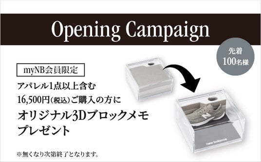 店内アパレル1点以上を含む16,500円(税込)以上ご購入いただいた先着100名様のmyNB会員様に、オリジナルの3Dブロックメモをプレゼントいたします。