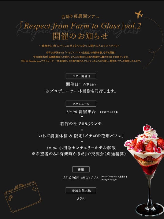 住所非公開の会員制パフェバー『Remake easy(リメイクイージー)』を運営するRemake easy株式会社 (東京都渋谷区、CEO:林巨樹、以下「Remake easy」)は、昨年好評を博した体験型イベント「Respect from Farm to Glass」の第2弾として、栃木県「高橋農園」へのイチゴ農園ツアーを2025年4月9日(水)に開催いたします。