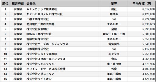 株式会社SalesNow(本社:東京都渋谷区、代表取締役:村岡功規、以下「当社」)は、国内540万社の企業情報を完全網羅した日本最大級のデータベース「SalesNow DB」より、上場企業を対象に茨城県に本社を置く企業の平均年収データを集計・分析し、「平均年収ランキング」として公開いたしました。