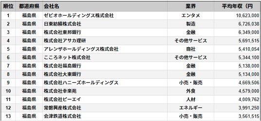 株式会社SalesNow(本社:東京都渋谷区、代表取締役:村岡功規、以下「当社」)は、国内540万社の企業情報を完全網羅した日本最大級のデータベース「SalesNow DB」より、上場企業を対象に福島県に本社を置く企業の平均年収データを集計・分析し、「平均年収ランキング」として公開いたしました。