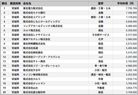 株式会社SalesNow(本社:東京都渋谷区、代表取締役:村岡功規、以下「当社」)は、国内540万社の企業情報を完全網羅した日本最大級のデータベース「SalesNow DB」より、上場企業を対象に宮城県に本社を置く企業の平均年収データを集計・分析し、「平均年収ランキング」として公開いたしました。
