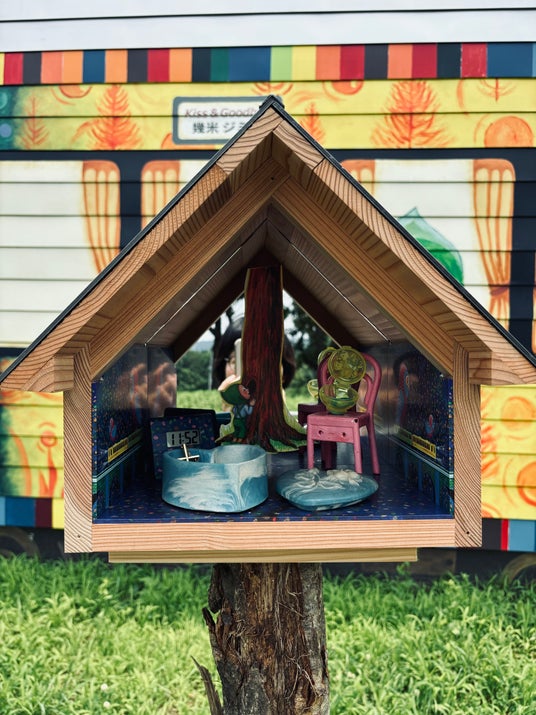 台湾の絵本作家ジミー・リャオの出展作品「2024幸せのきっぷ Kiss & Goodbye」は、飯山線土市駅と越後水澤駅のイメージを隣接する草地に広げ、豪雪地帯には欠かせないかまぼこ型倉庫内に複数のミニチュア立体駅とミニ空間を創り出す。外観はナチュラルでシンプル、倉庫内には別世界が広がる。地元の人々から忘れられない大切な物を預かり、丁寧に展示され、大切な思い出に浸ることができる空間を創り出している。ジミー・リャオは、「幸せのきっぷ Kiss & Goodbye」に訪れた人々が、想像力豊かで奇妙な旅を楽しむよう期待している。作品周辺を散策、探索しながら、身近の大切な人や物事について思索に耽ることができるでしょう。