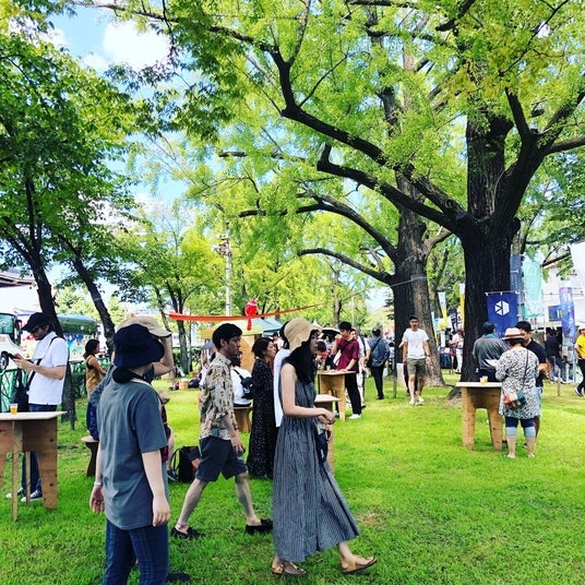 横には烏丸通りという大きな道が南北に走っているのですが、スペースを囲むように2つの大きな樹木のある芝生エリアが広がっていることから、街の中にいながらも、ゆったりと落ち着いた気分にしてくれるのもこの場所の魅力のひとつ。木陰でゆったり腰を下ろし、ビールを楽しむには最高のロケーションです。わいわいと活気のあるイベントでありながらも、混雑しすぎず、リラックスしながら楽しめるひとときになることを目指しています。