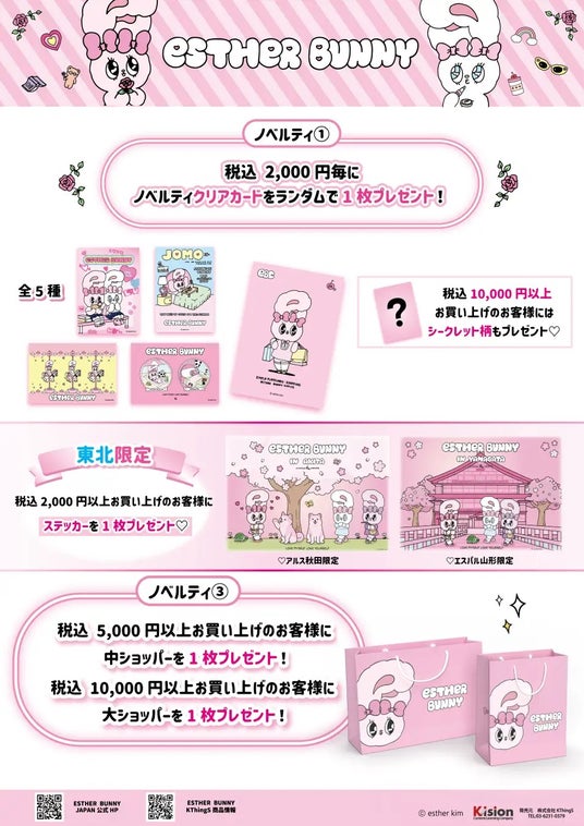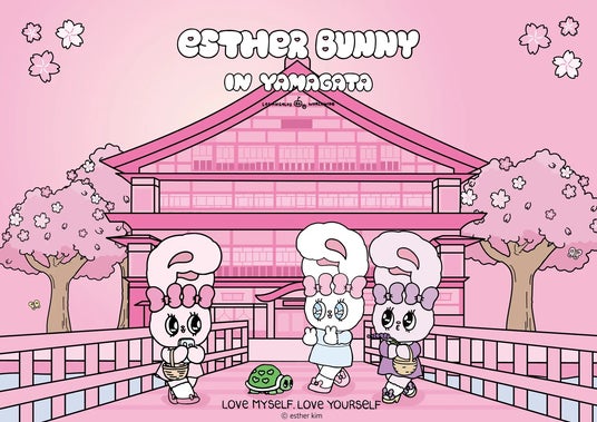 エスターバニーは人気イラストレーター「エスター・キム」が生み出したキャラクター。ふんわりとした丸いフォルムに大きな耳、そして愛くるしい表情が特徴です。今回は『エスターバニー東北ツアー』としてエスターバニーが東北各県に訪れ文化を楽しみます。山形県は銀山温泉を訪れるエスターバニーのイラストも公開!既存の人気商品だけでなく新商品も多数展開し充実したラインナップを大きなぬいぐるみフォトスポットやピンクの世界観と一緒にお楽しみください。