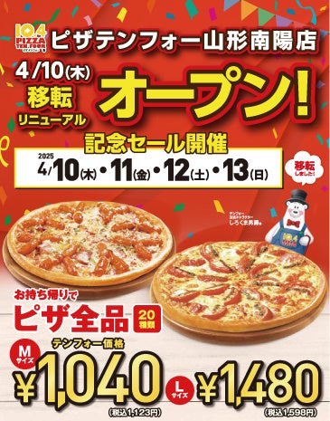 北海道生まれの宅配ピザチェーン 10.4(テンフォー)を運営する、株式会社テンフォー(本社・北海道函館市/代表・高橋仁志) は、2025年4月10日(木)に山形南陽店(住所:山形県南陽市郡山630-3)を移転リニューアルオープンいたします。