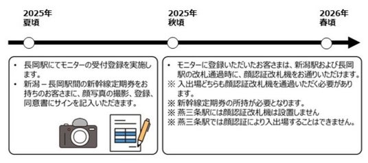 ○その一環として、2025年秋頃、上越新幹線の新潟駅と長岡駅に顔認証技術を用いた改札機を設置し実証実験を行います。