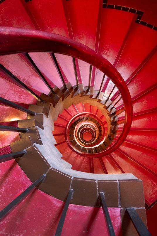 前川國男が設計し昭和36年(1961)に竣工した東京文化会館の階段。真っ赤な螺旋が4階分を貫き、非日常空間に誘う。