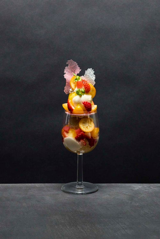 東京『Maison heureux清澄白河』の「金柑・いちご・ほうじ茶のパフェ」。シェフパティシエの石内恵さんはスパイス使いがビシッとシャープ。食べれば、体がシャキッと躍動するパフェ。