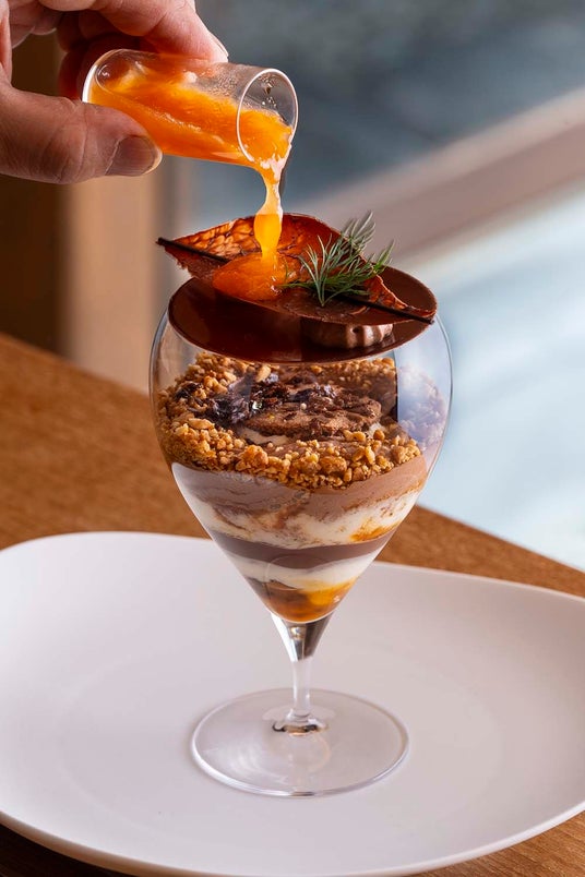 京都『アッサンブラージュ カキモト』の「フューチャーミュージアム」。ムースやクリーム、アイス、ソース、クッキー地を重ね、温度や食感のコントラストをつけたパフェ。