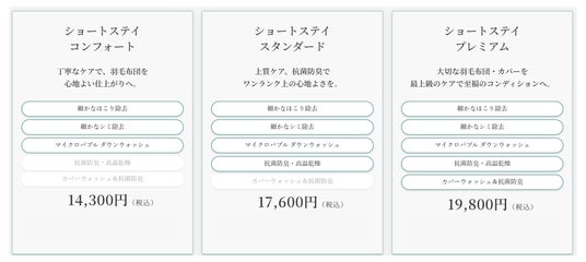 布団のホテル(TM)︎「ショートステイ」は羽毛布団の洗浄に特化。洗浄前に縫い目のホコリ除去、シミや汚れの除去をおこない、マイクロバブル水での個別洗浄、洗浄後の抗菌防臭加工を施します。ショートステイコンフォート14,300円(税込)~