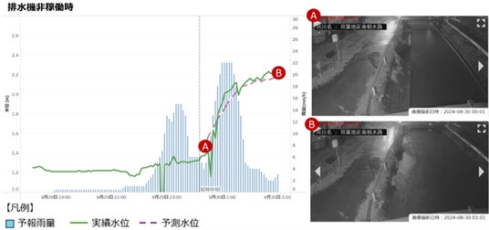 実測雨量を用い、A時点(8月30日0時)に3時間後のB時点(8月30日3時)の水位を予測しました。環境要因や人為的要因をパラメーター化して予測した水位に対して、実水位結果はほぼ同様の曲線を描いています。(図1)