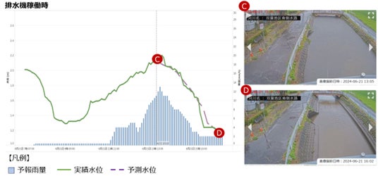 実測雨量を用い、C時点(6月21日13時)に3時間後のD時点(6月21日16時)の推移を予測しました。予測した水位上昇スピードや上昇幅に対して、実水位結果もほぼ同様の曲線を描いており、排水機の稼働という人為的要因を考慮した予測ができていることを確認しました。(図2)
