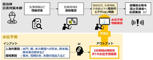 また、いざという時の避難指示発令のためにリードタイムを確保する観点から6時間先までを予測可能なAIモデルとしました。予測結果は、浸水対策や周辺住民の避難、交通規制など事前行動の判断材料となり、被害軽減に役立てることができます。